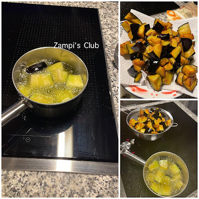 * En un cazo o cazuela pequeña con abundante aceite vamos friendo la berenjena en tandas pequeñas. Las dejamos sobre papel absorbente para que suelten el exceso de grasa. Reservamos.